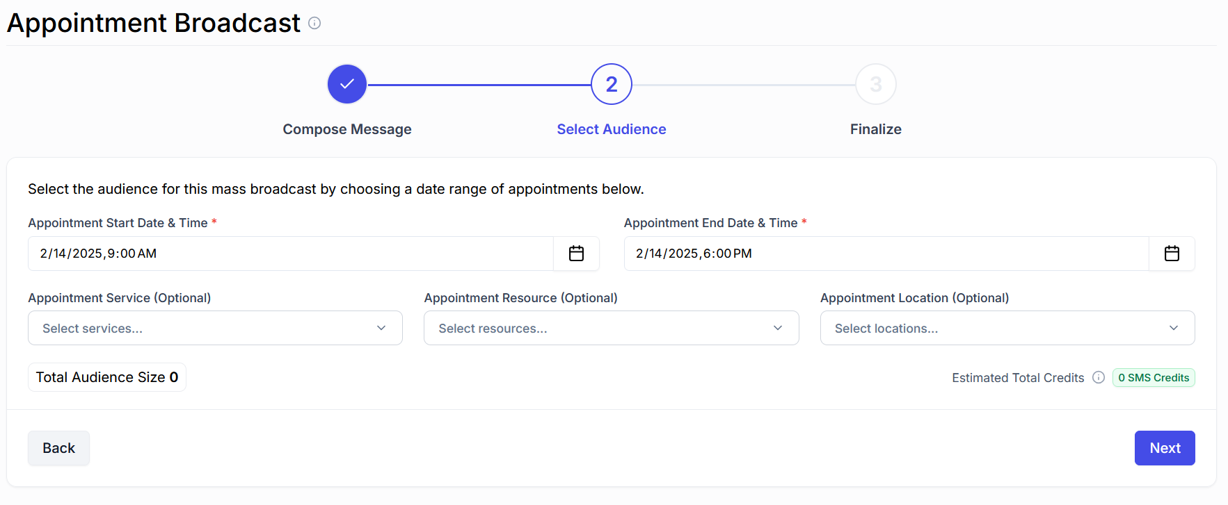 Use the date and time selectors to choose a range. Everyone with an appointment scheduled within that time window will receive the message.